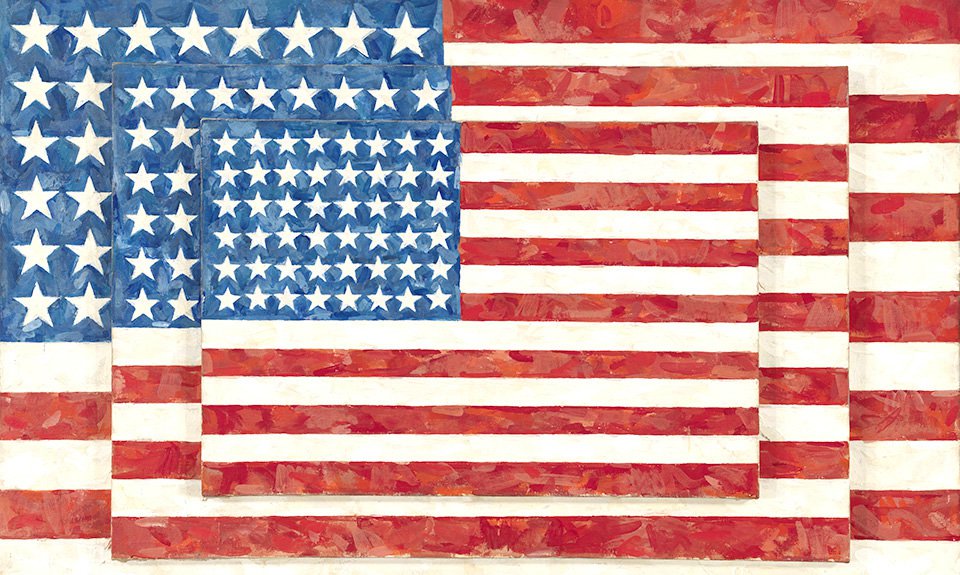 «Мишень с четырьмя лицами» (1955), «Три флага» (1958) и «Карта» (1961) Джаспера Джонса обладают захватывающей, хоть и причудливой красотой, холодной и отчужденной, но густой, как глазурь на торте. Они вполне заслуженно упоминаются во всех курсах истории послевоенного американского искусства. Джонс гениально сочетал энкаустику и коллаж, создавая поверхности, заставляющие всматриваться внимательнее.