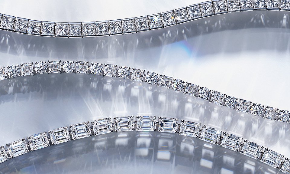 Никого не оставит равнодушным необычный теннисный браслет с 22 бриллиантами изумрудной огранки, по карату каждый, гибким рядом облегающий запястье. При всей сдержанности дизайна такое количество крупных драгоценных камней в минималистичной эстетике концентрирует внимание именно на безупречных бриллиантах, воплощая собой идею об элегантной роскоши. Еще два варианта украшений, от которых захватывает дух, — многоярусное колье-фестон с искрящимся потоком бриллиантовых лент и ожерелье, буквально сложенное из алмазной мозаики: на ее создание ушло более 420 бриллиантов.