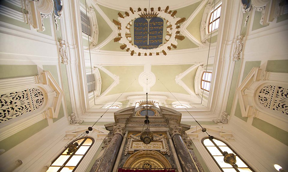 Неоклассический интерьер синагоги, построенной по проекту флорентийского архитектора Джузеппе дель Россо в 1786 году, украшен элементами декора в стиле рококо. В ней находится разнообразная ритуальная утварь, в том числе кресло пророка Элияу и менее крупные объекты, хранящиеся в синагогальном ковчеге с мраморными колоннами. Мемориальные таблички напоминают о столетиях преследований — от погрома 1799 года до депортации в нацистские лагеря смерти в 1943 году.