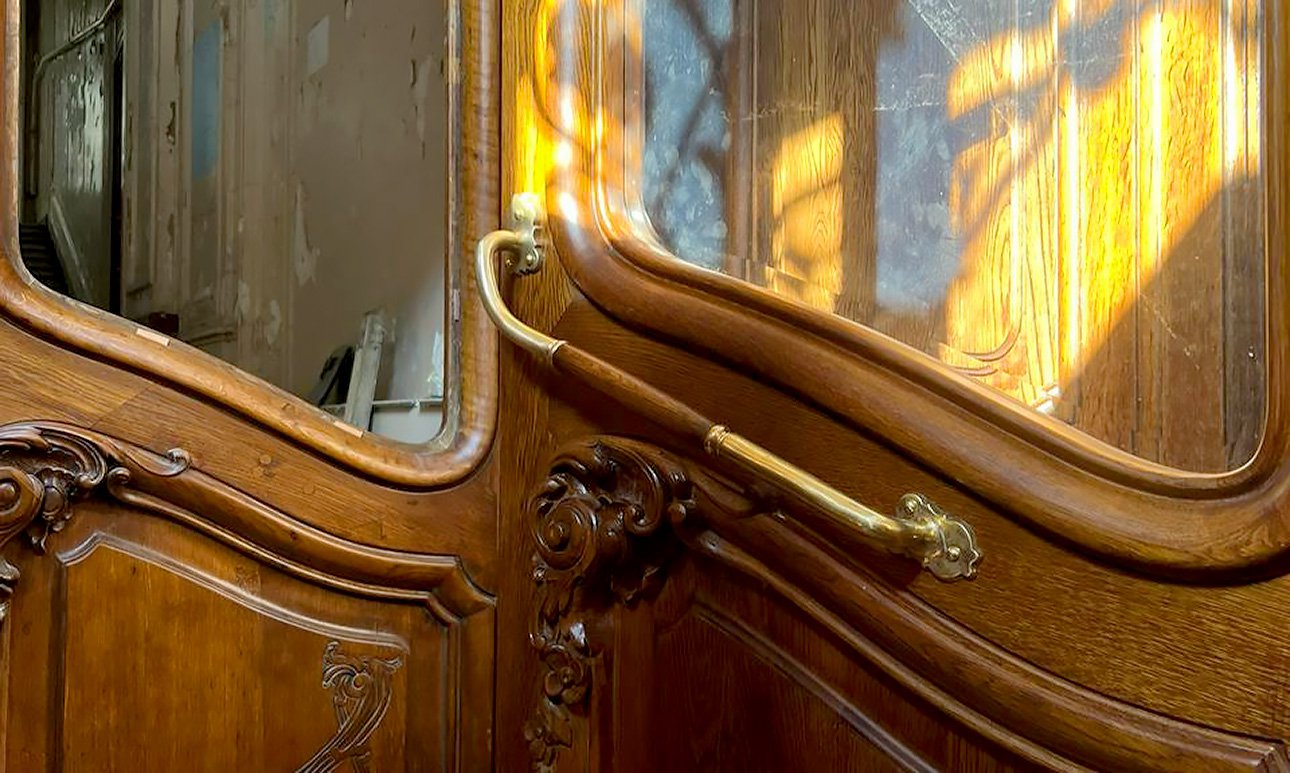 История с восстановлением началась в 2017 году, когда жильцам дома стало известно, что несколько дверей из парадных оказались в кафе «Рубинштейн» — там их использовали для оформления интерьеров. Из доходного дома, построенного в начале XX века архитектором Юлианом Баком, они пропали еще в конце 1990-х: коммунальные службы тогда заменили деревянные двери на железные. К моменту, когда две пары исторических дверей нашлись, жильцы дома уже создали сообщество в соцсетях, занимавшееся проектом по возвращению зданию исторического облика.