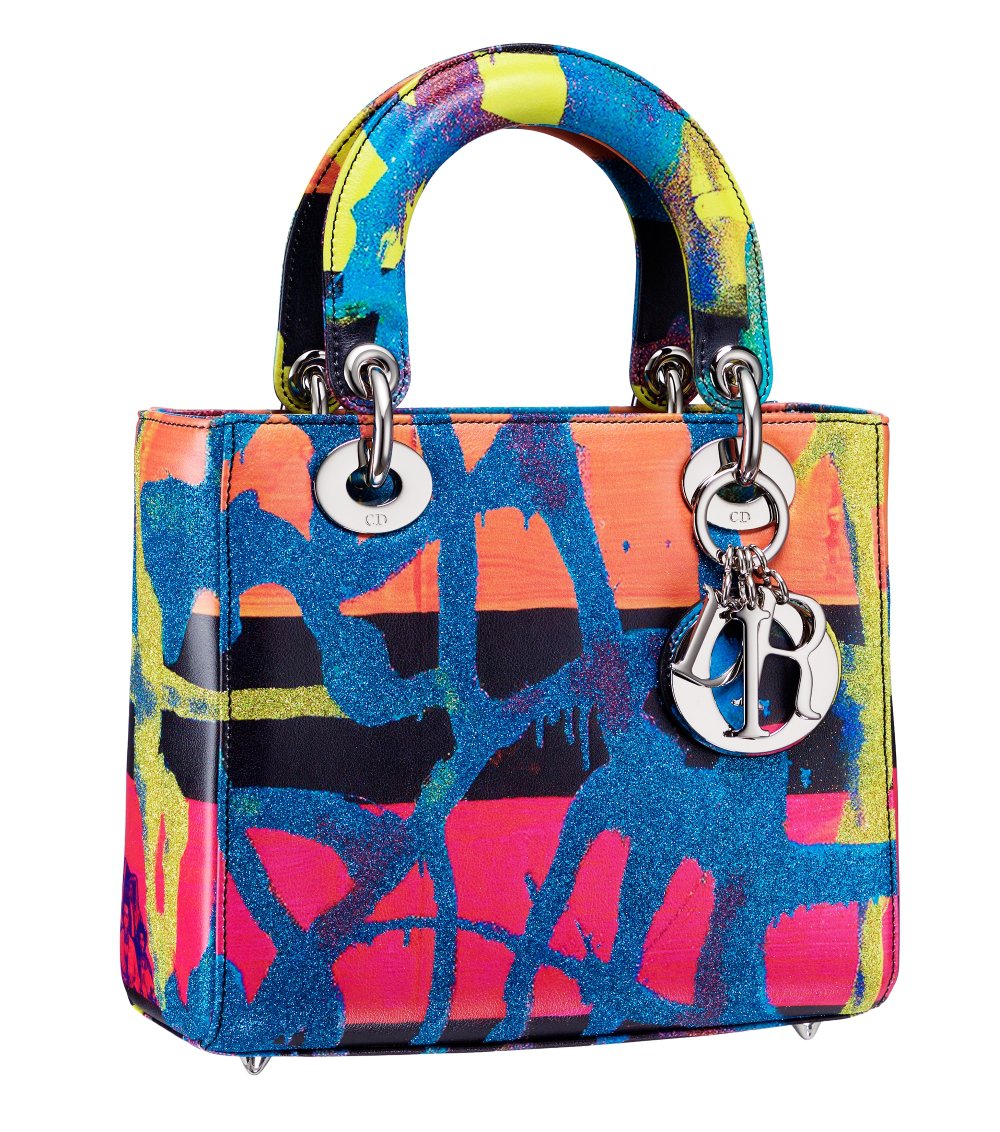 Достойный соперник сумке Мартина — вариант Lady Dior от Йена Дэвенпорта. Его главный помощник в работе — сила притяжения, свои произведения художник создает с помощью краски, которую наносит на металлические пластины шприцем. Цветные полосы, поддаваясь гравитации, ползут вниз, поначалу не смешиваясь, но в итоге сливаются в единую массу, рождая новые оттенки и формы. Для дизайна сумки Дэвенпорт взял за основу собственную серию картин Colorfall, перенеся композицию на серебристую кожу и сделав ее объемной и ребристой.