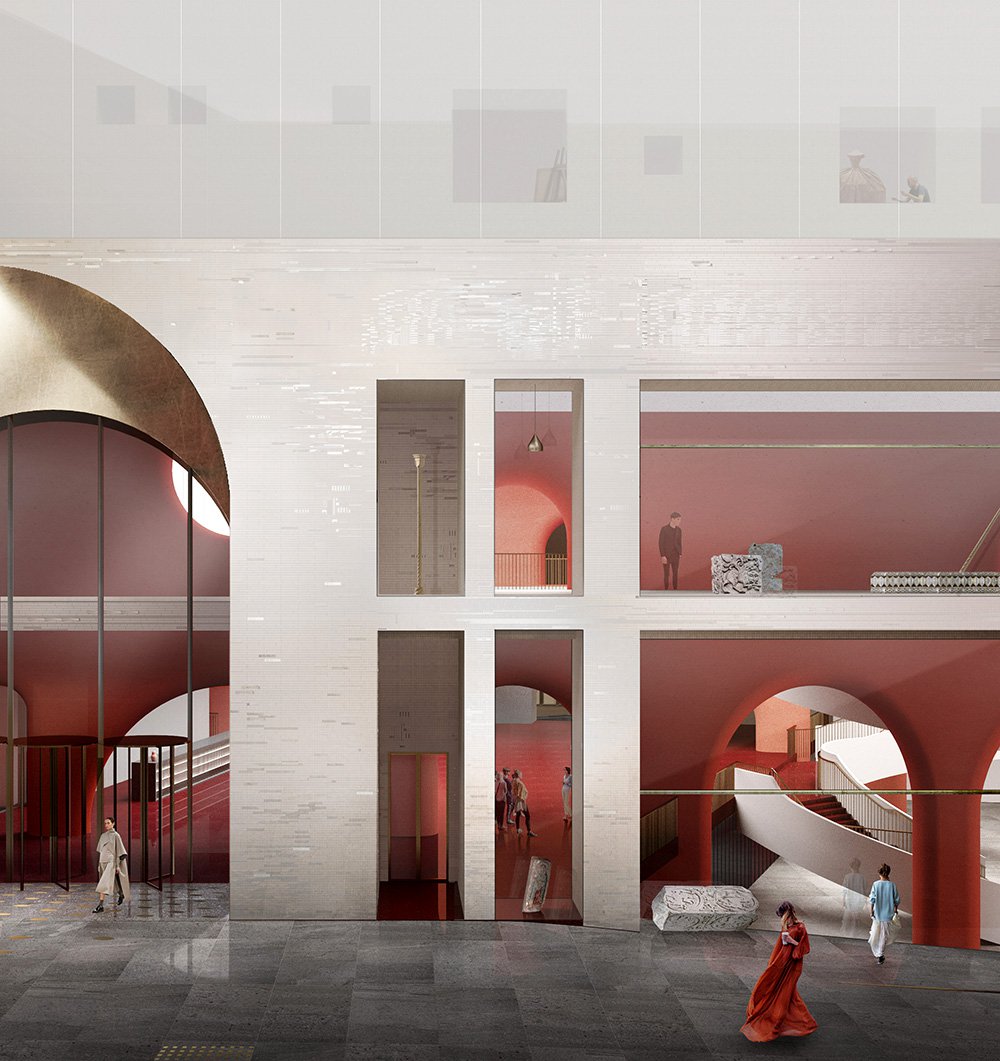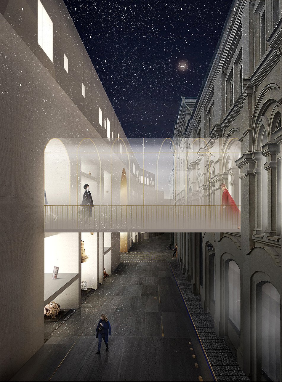 Так что с нынешним проектом Москве повезло. Вписывая новый объем в уже существующий исторический ансамбль, Григорян не стал перекрывать внутренний двор — это и невозможно по закону. «Наружное здание, — объясняет архитектор, — ограничивает внутреннюю улицу, куда затекает пространство Красной площади. Первый этаж его полностью открыт: кафе, магазины, детское пространство. Круглая лестница поднимает нас на уровень экспозиции, сосредоточенной на одном этаже. Это вынужденная мера: здание стоит на сложном рельефе и „скачет“ — нет ни одного плоского этажа, поэтому во внутреннем здании нам пришлось решать эту проблему. С наружным зданием его соединяют три моста. Таким образом, можно будет пройти всю экспозицию, не поднимаясь с одного уровня на другой».