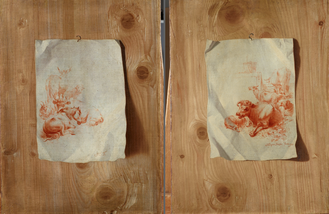 Выставка — про обманки, которые не копии и тем более не подделки. Здесь расчет на разгадывание, желательно в совместном смотрении с тем, кто уже обманулся, чтобы удивиться мастерству художников. Или спровоцировать соревнование между зрителями: кто быстрее раскроет секрет, попав вдруг в «египетскую пирамиду», в «парадную столовую» или в «кабинет-библиотеку», и так же быстро поделится своим открытием с окружающими. Таким секретом может быть книжная полка, где стоят «Две книги» — роспись на плоской деревянной доске кисти неизвестного голландского мастера конца XVII — начала XVIII века, возможно, работавшего в России. Обманка эта принадлежала Петру I, который ввел моду на создание подобных «библиотек». На другой полке размещены «монеты», которые открываются, как коробочка, а внутри обнаруживаются картинки.