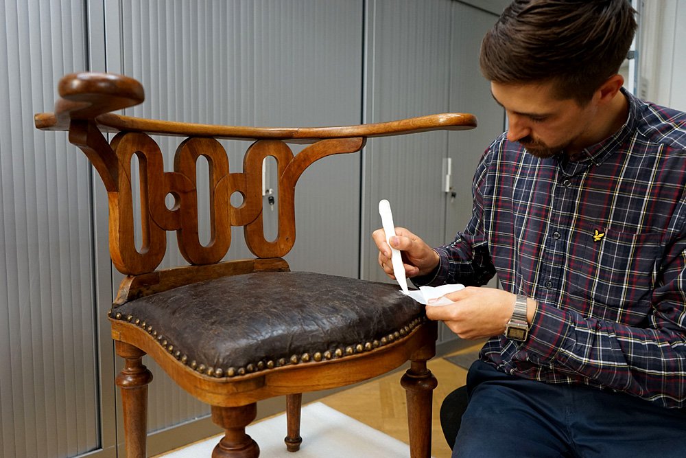 Как рассказал нашему изданию Юрий Макаров, заведующий отделом реставрации фанерованной мебели, необходимо было привести предмет в экспозиционное состояние, максимально сохранив исторические элементы. «Кресло реставрировали еще в XIX веке, реставрация тогда была основательной, на сегодня это тоже своего рода реликвия, поэтому мы решили сохранить и следы реставрации полуторавековой давности, — сообщил он. — Были проблемы и с самой конструкцией кресла. Подлокотники у него слишком длинные, нагрузка на них и на узел соединения деталей неравномерная, из-за чего пришлось использовать дополнительные детали крепления».