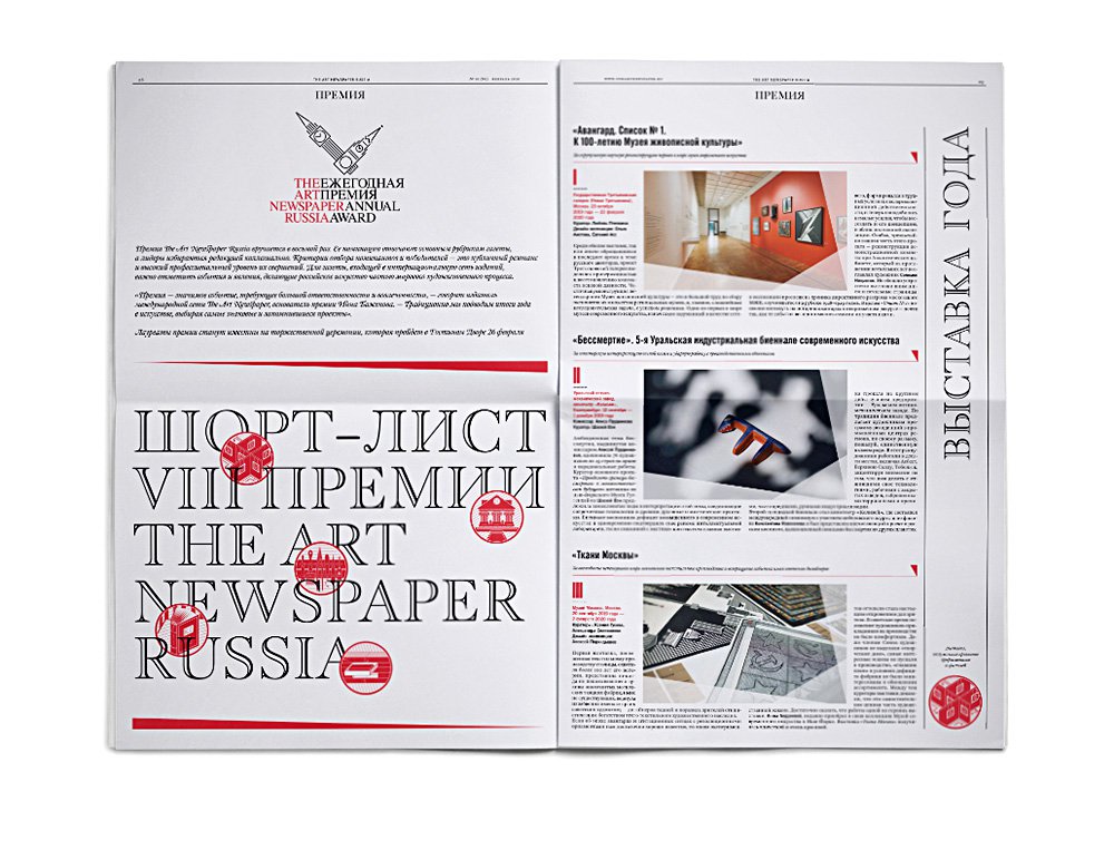 Шорт-лист VIII Премии The Art Newspaper Russia. Лауреаты премии в пяти номинациях: «Выставка года», «Музей года», «Реставрация года», «Книга года» и «Личный вклад», — станут известны на торжественной церемонии, которая пройдет 26 февраля в Гостином Дворе.
