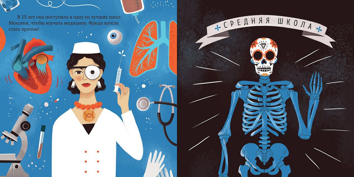 Знакомство с биографиями великих людей можно продолжить по книге «Фрида Кало. История про художницу, которая нарисовала себя и свою жизнь». Авторы издательства Clever Анна Герасименко и Лилу Рами легким и увлекательным языком рассказывают о судьбе великой Фриды, не вдаваясь в детали «для взрослых». История художницы, приправленная колоритными иллюстрациями Ирины Вовк, должна особенно понравиться девочкам и вдохновить их на подвиги и свершения без оглядки на стереотипы. «Когда девочке было всего 6 лет, она тяжело заболела и после болезни стала хромать. „Фрида — деревянная нога!“ — дразнили ее ребята. Но она не слушала их. Она плавала, играла с мальчишками в футбол и даже занималась боксом. Фрида всегда была сильной и смелой девочкой», — уверяют авторы. Помимо воодушевляющего подтекста, книга направлена и на эстетическое воспитание. Благодаря ярким иллюстрациям она окунет читателя в мир Мексики, буйных красок, страсти и безграничного творчества.