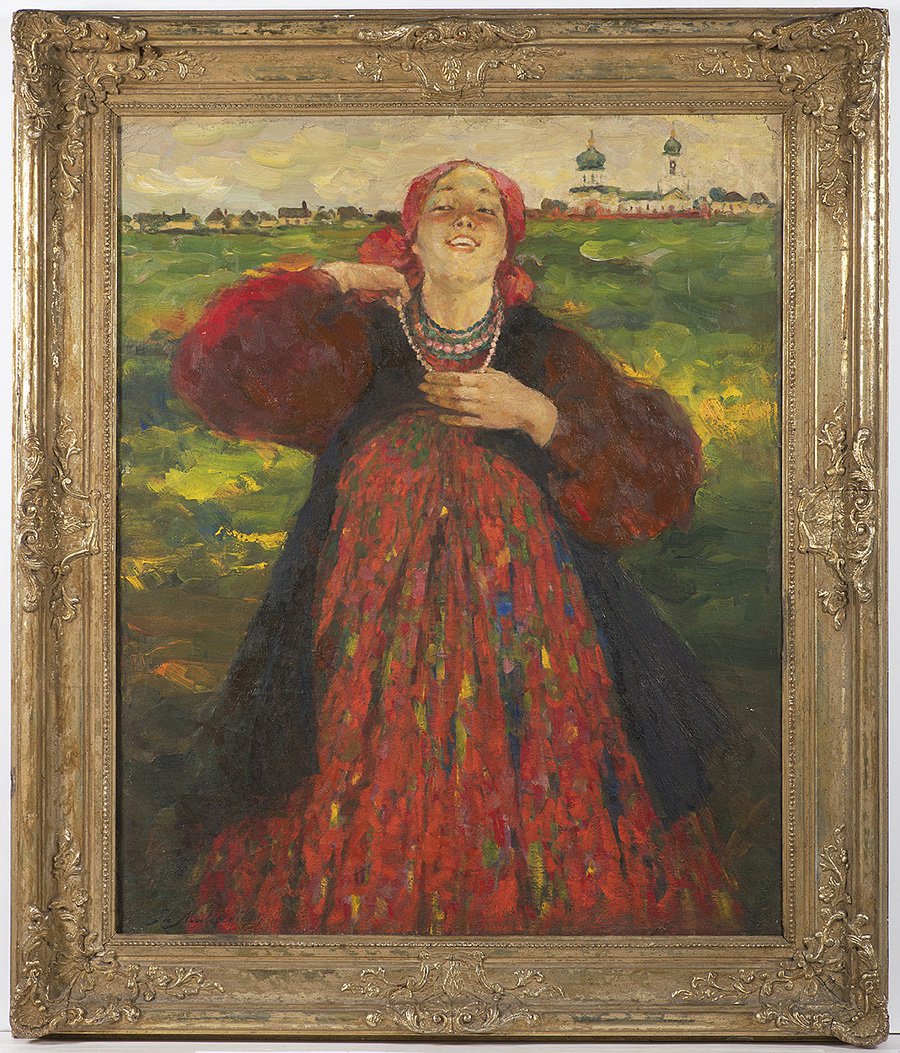 Обращает на себя внимание «Русская девушка» Филиппа Малявина. Она написана около 1910 года и относится к циклу произведений, кульминацией которого стал яркий «Вихрь», воплощение экспрессивного дара художника (хранится в Государственной Третьяковской галерее). Неукротимым народным духом веет от этого полотна, а яркий сарафан, белозубая улыбка, деревенька с храмом на горизонте — детали, характерные для лучших работ Малявина из народной серии. Картина оценена в 750 тыс. чешских крон (€30 тыс.).